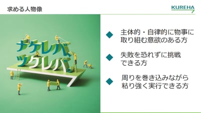 〒103-8552 東京都中央区日本橋浜町3-3-2 人事総務部 採用担当 Mail:recruit@kureha.co.jp